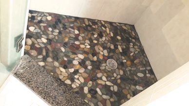 Double shower install of river rock